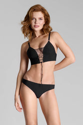 Culotte ouverte par un jeu de laçage ajustable au dos qui laisse apparaître de jolies fesses. À l’avant, l’opacité structurée par deux découpes joue la discrétion. Les œillets et le régleur en métal noir ton sur ton permettent de faire glisser les cordes rigides avec précision.