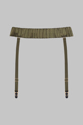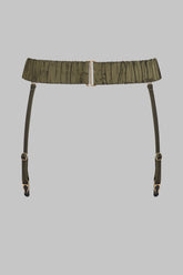 Ceinture porte-jarretelles en soie naturelle. Une ceinture élastique recouverte de soie froncée et accessoirisée d’un fermoir doré. Attache dorée à placer à l’avant ou au dos selon vos envies tel un bijou. Quatre jarretelles élastiques, amovibles et réglables aux finitions dorées. Les deux jarretelles courtes à placer à l’avant, les deux jarretelles plus longues au dos.