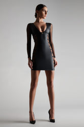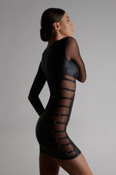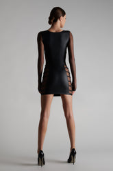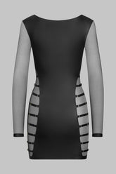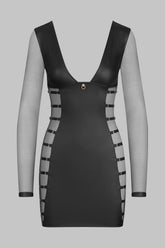 Robe manche longues qui joue un double effet-cuir mat et tulle transparent. Décolleté plongeant et coupe ajustée qui souligne la silhouette. Tulle transparent harnaché de straps élastiques réglables sur les côtés. Signature de la collection, un anneau « féti-chic » doré orne le devant et suggère l’attachement.Une lingerie impudique qui se transforme en une pièce de prêt à porter tendance, à montrer de jour comme de nuit.
