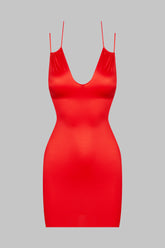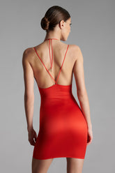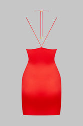 Robe courte alliant douceur satinée et style unique. Décolleté structuré par un subtil plissé. Le laçage tour de cou, repositionnable et ajustable grâce à un régleur unique et des accessoires lipstick dorés signés Maison Close, sublime le décolleté et le dos tout en permettant une personnalisation selon vos envies.