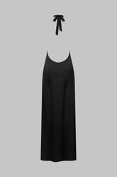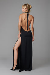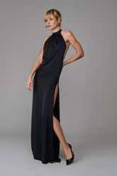 La robe dos nu se distingue par sa coupe longue et droite qui épouse et dessine une silhouette épurée et affirmée. Confectionnée en satin double face et opaque alliant la douceur, la fluidité et une qualité incomparable. Un décolleté profond au dos et une fente vertigineuse sur la jambe, ne laisse personne indiffèrent. Une encolure américaine plissée au col se ferme par un ruban en satin double face à nouer dans le cou selon vos envies.