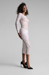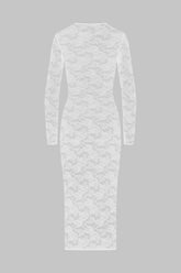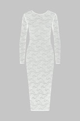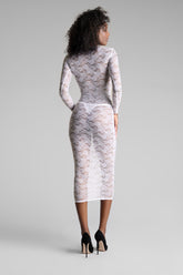 La robe longue à manches longues se pare d'une dentelle ajourée majoritairement recyclée. Coupe équilibrée bordée d'un élastique plat. Longueur midi qui souligne les courbes pour un style années 80 assumé.