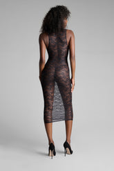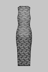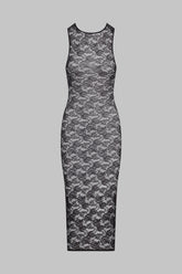 La robe longue sans manches se pare d’une dentelle ajourée majoritairement recyclée. Coupe ajustée bordée d’un élastique plat. Longueur midi qui souligne les courbes pour un style années 80 assumé.