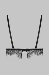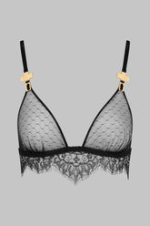 Soutien-gorge triangle en tulle plumetis extensible sur les bonnets. Des bretelles style porte-jarretelles ornées par des croix dorées sont réglables et amovibles à l’avant uniquement pour un effet seins-nus. Une fermeture ajustable par un agrafage au dos. Une dentelle à cils rigide vient sublimer le tour de dos.