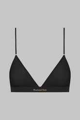 Soutien-gorge triangle sans armatures. Élaboré dans un jersey fin aux reflets brillants et subtilement transparents, il est bordé d’un élastique ultra plat invisible sous les vêtements. La signature dorée du logo Maison Close s’inscrit à l’entre sein sur une large bande élastique qui assure le maintien. Fermeture au dos par un agrafage ajustable lisse et fin. Bretelles fines réglables et non amovibles aux accessoires dorés.