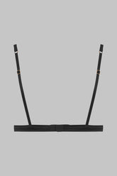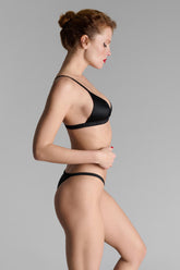 Soutien-gorge triangle en soie naturelle. Bonnets forme triangle sans armatures qui épousent parfaitement les seins. Fines bretelles recouvertes de soie froncée à l’avant et élastiques réglables au dos par des accessoires dorés. Bande élastique recouverte de soie froncée sous les seins. Fermeture au dos par un agrafage ajustable.