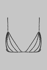 Triangle bijou en perles de verre facettées d’un noir profond. Le triangle À ton cou reflète la lumière au rythme des mouvements. Réglable et ajustable grâce aux chaînes de réglage.